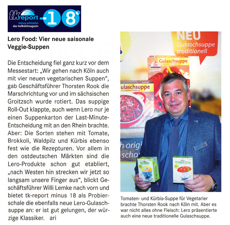 Unsere neuen vegetarischen Cremesuppen stießen auf ein positives Echo auf der ANUGA und bei der Fachpresse im Tiefkühlmagazin "tk-report / minus 18". Gleich 5 Sorten unseres neuen Veggie Sortiments durften auf der ANUGA bestaunt werden – lesen Sie dazu den Artikel ›